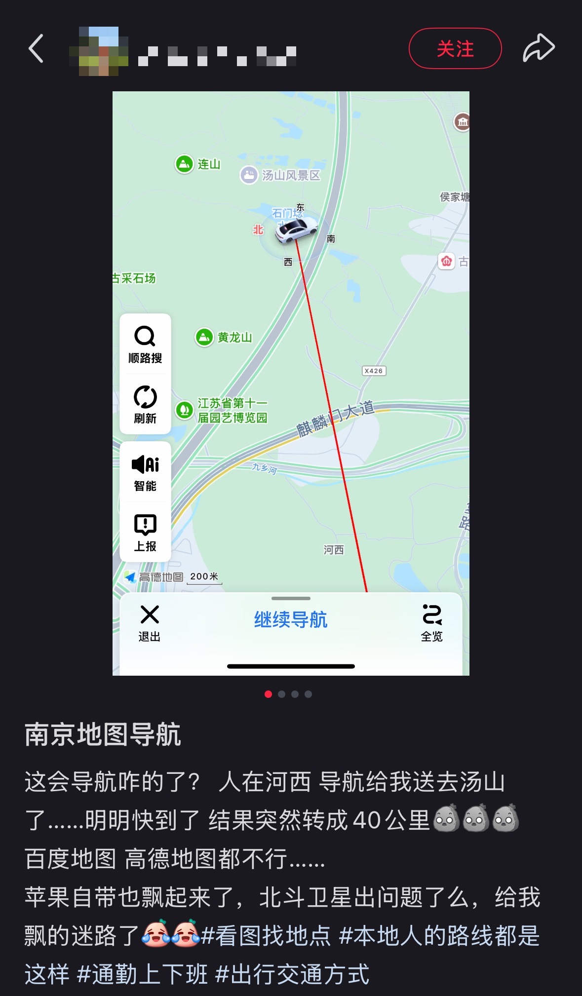 12月17日傍晚,多名南京网友发帖称,多个常用的导航软件出现定位不准、导航路线出错等问题。有网友反映,“导航崩溃了,一会显示在秦淮,一会显示在鼓楼。”也有网友表示,“人在河西,导航给我送去汤山了,明明快到了,结果突然转成40km,百度地图、高德地图都不行,苹果自带的也飘了起来。”另有网友反映,“人在江心洲家里,已经跑玄武湖里面去了。”